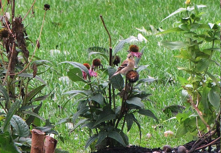 American Goldfinch in Fall plumage enjoying Coneflower seeds.