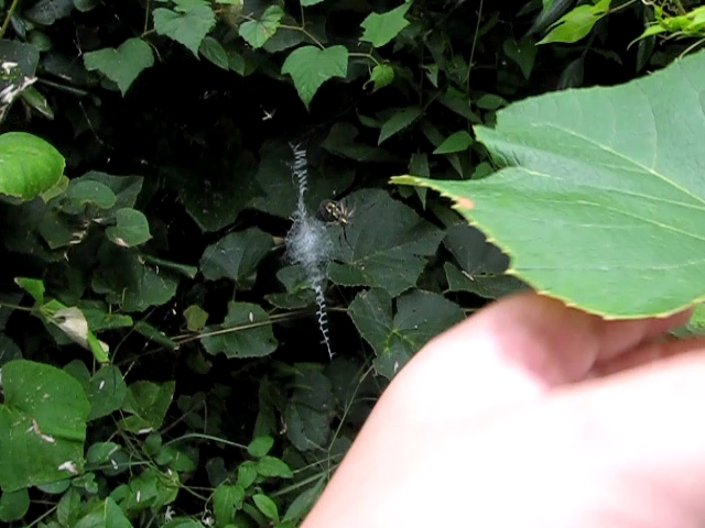 Comments on Argiope. My movement near her orb web arouses her interest and she moves out into view.
