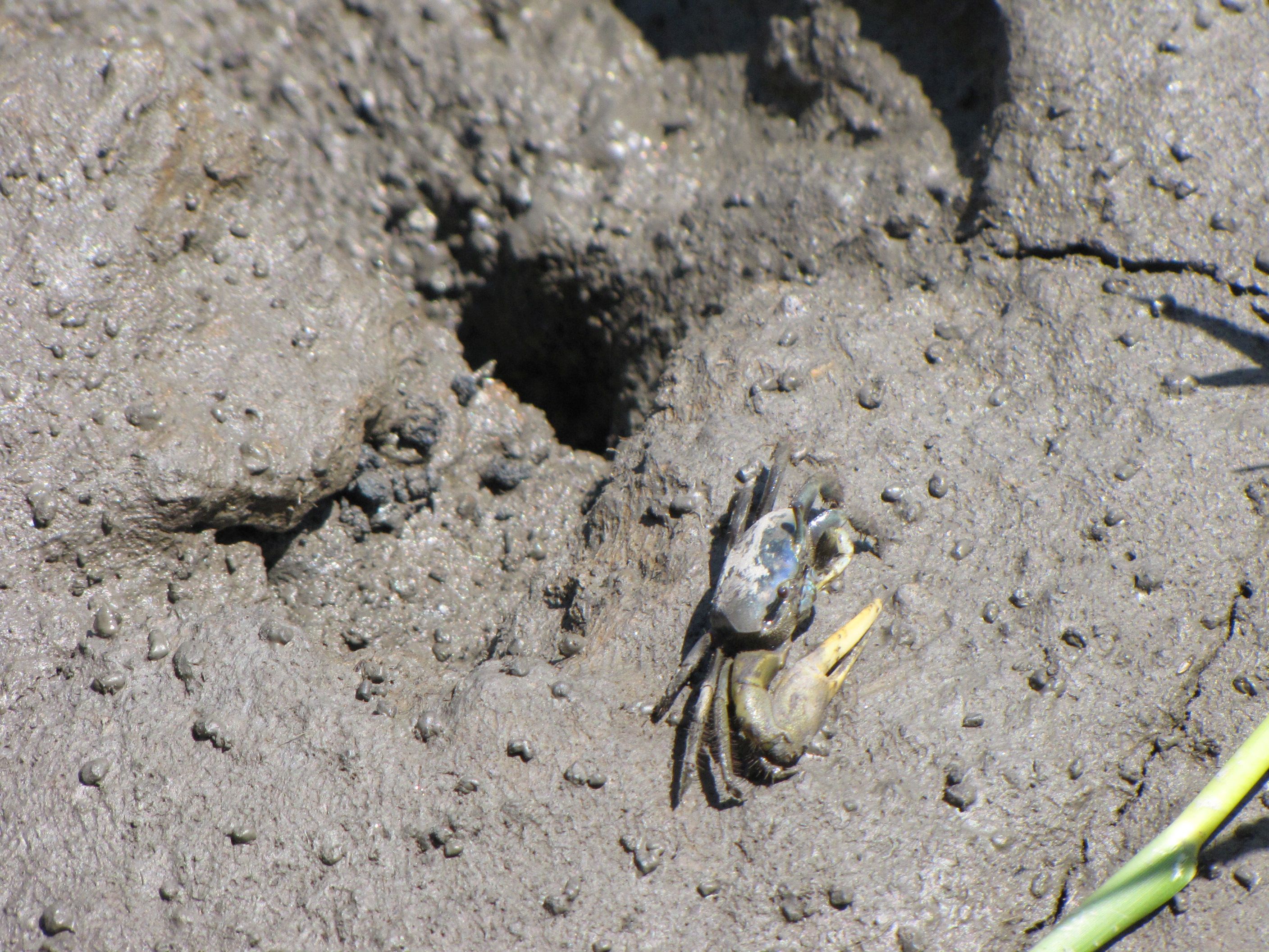 Comments on Atlantic Marsh/Mud Fiddler Crab with burrow and recycled food pellets. They put mud in their mouths, and poop out the left-overs in little pellets.