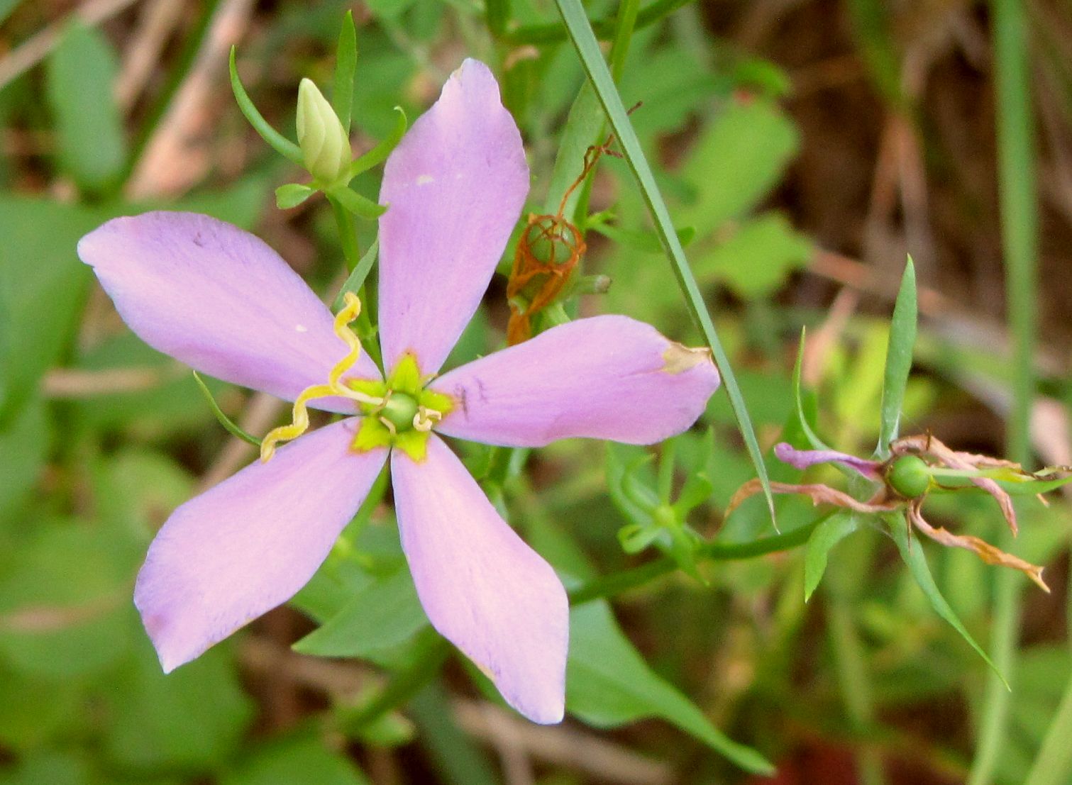 Rose Pink - A bud, a blossom, and one gone to seed. The stamens have dried up, but the pistil is still showing off.
