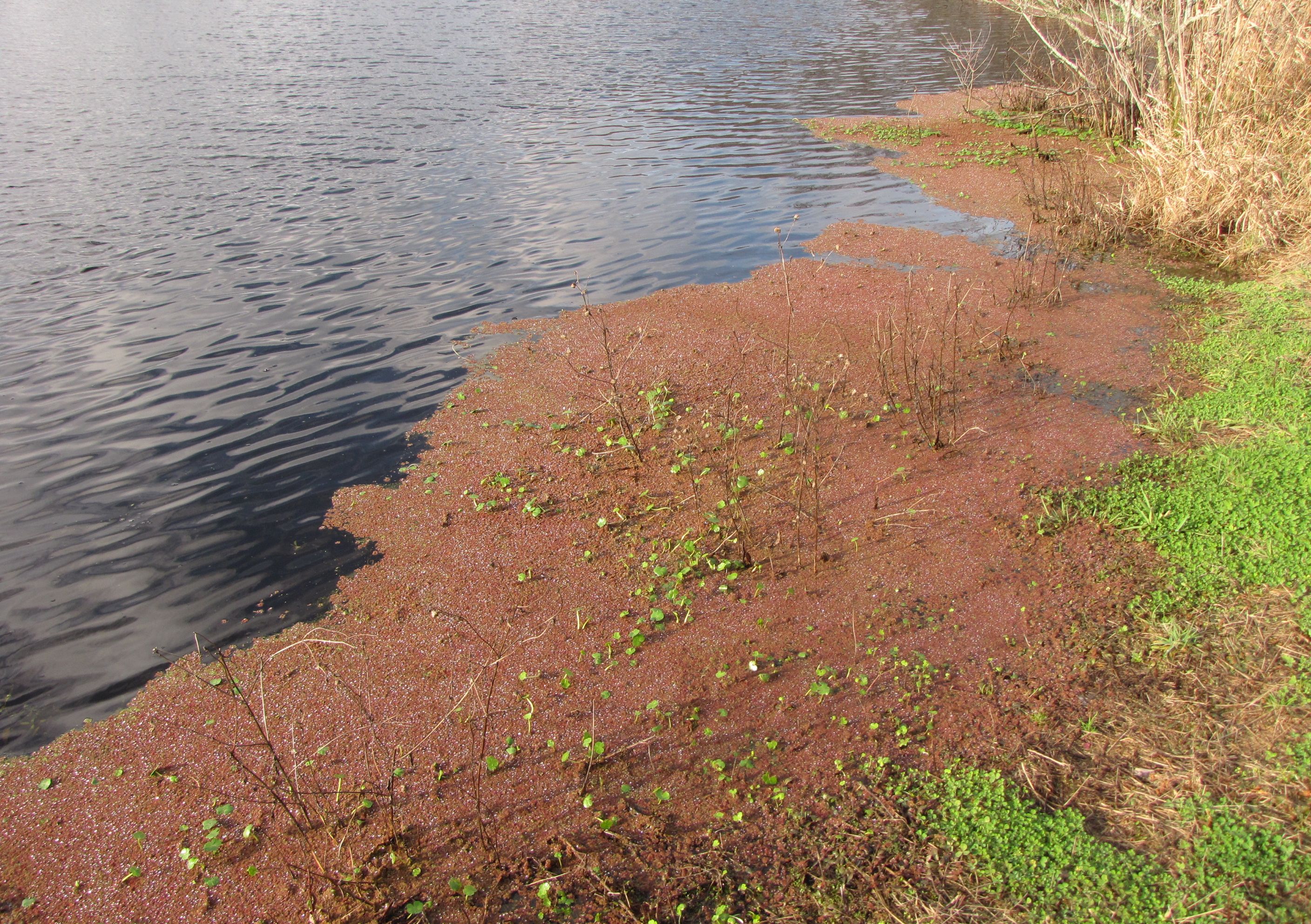 Curious about the red blanket on the water, I find out it's an aquatic fern, the Eastern Mosquito-fern.