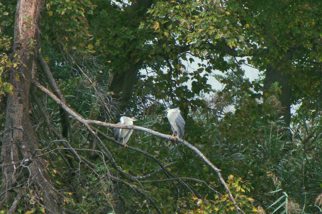 Black-crowned Night Herons. Not too far away on a fence was a young one. Perhaps these are the parents.