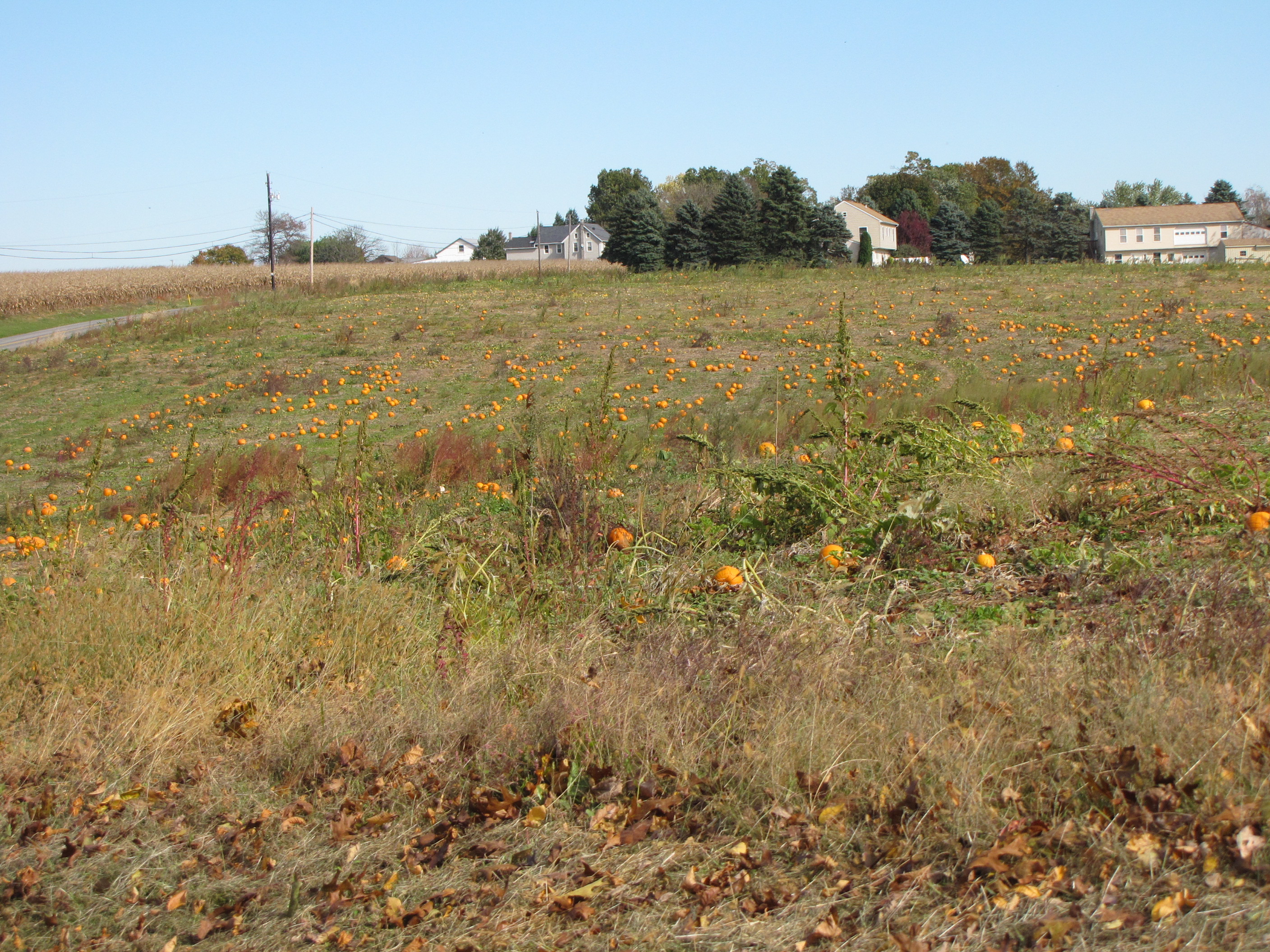 Pumpkins covering acres of ground with orange polka dots as we head back home.