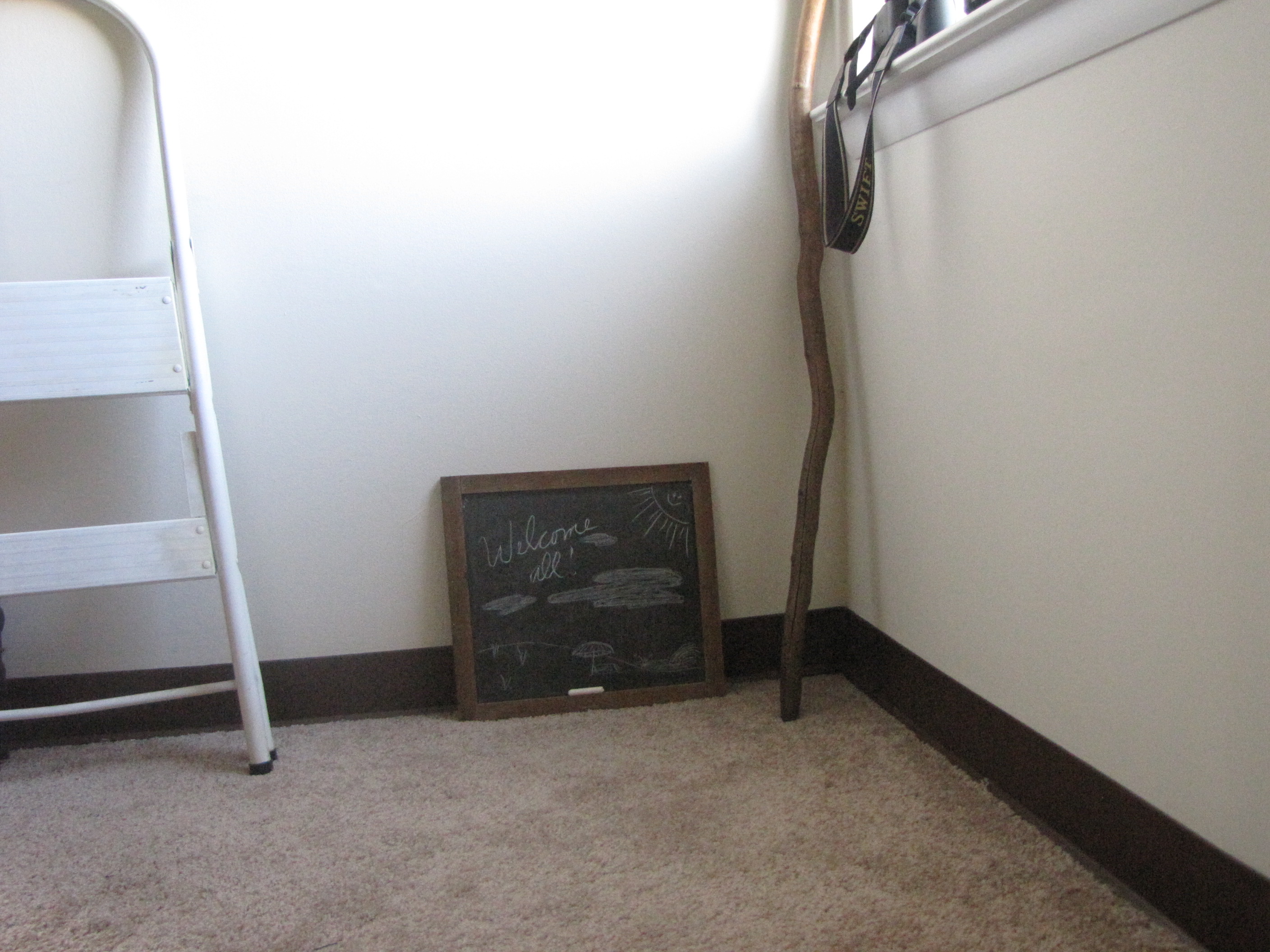 In the corner is a walking stick that David carved when he was a Boy Scout. It's made from a Sassafras sapling. It was gray and weathered and, when still living in Mickleton, he didn't want it anymore, I couldn't bear to part with it so I gave it a coat of shoe polish and polished it. I already used it here one day when my back was hurting too much from all the moving and being on my feet from unpacking. There's also a slate board on which I write seasonal messages. It's not the one I used in school in Germany with slate pencils, but it's just about the right size and shape and also has a great deal of meaning for me.