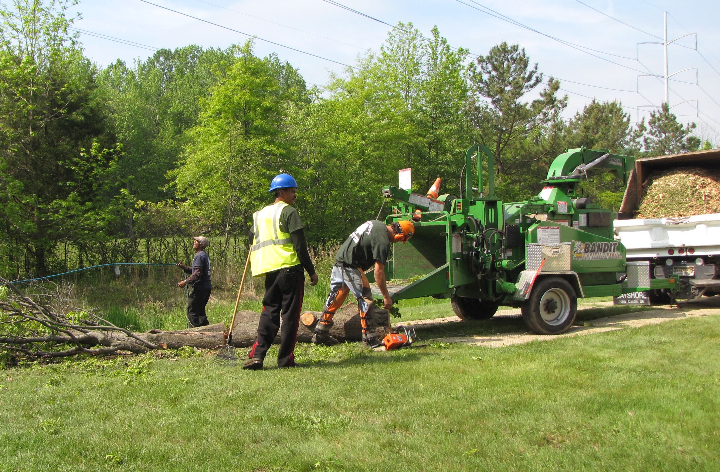 The tree top gets pulled over, the larger portion of the trunk gets sawed off and then, yes, there's a little room left in the hopper for the rest of the top.