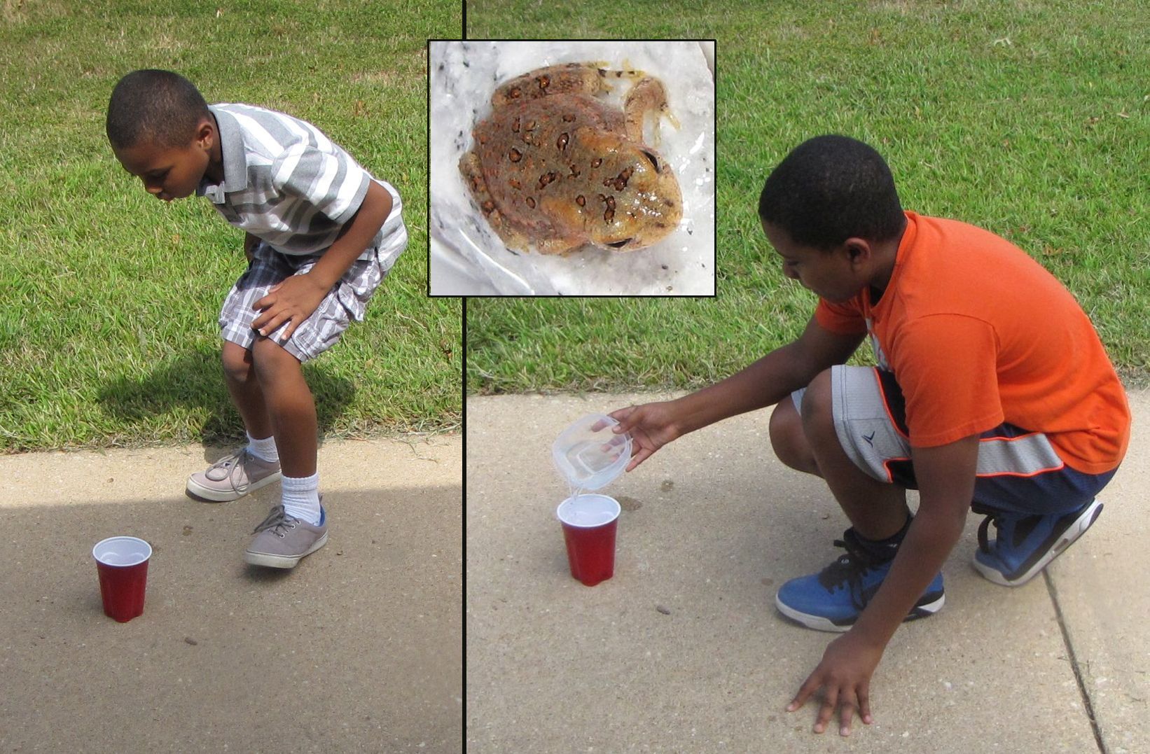 2015-8-28 - Trevor and Trenton observe a juv. American Toad and, earlier, a male Rabid Wolf Spider.