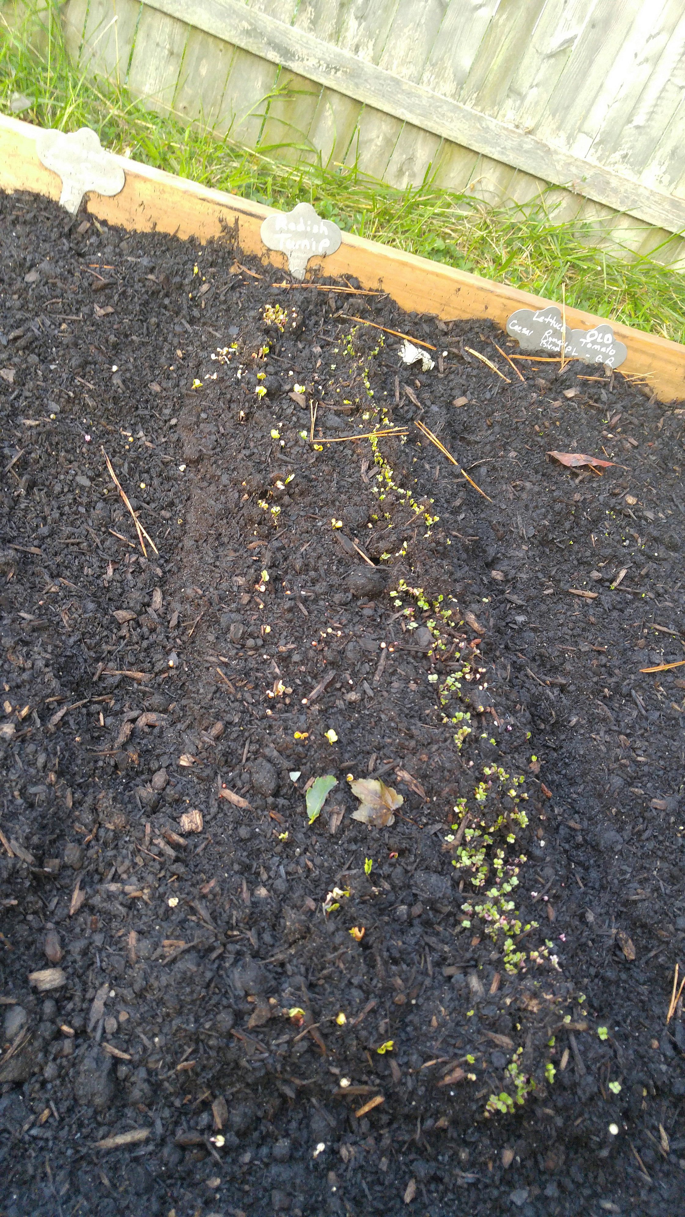A couple of weeks ago a raised bed was completed. Last week (end of Aug) seeds were planted and the first of those have sprouted this morning.