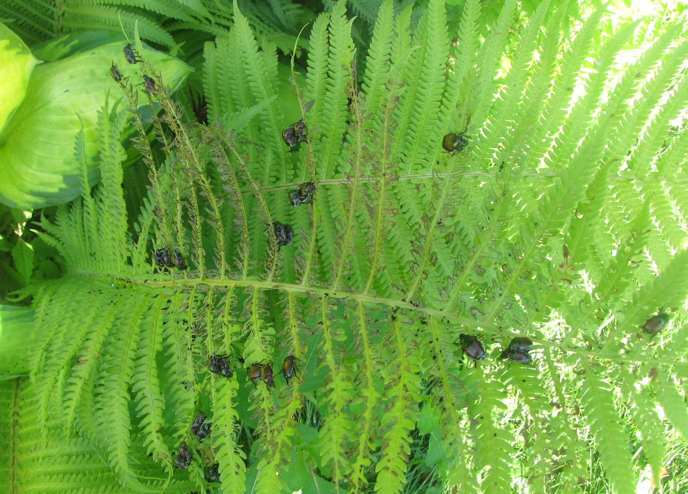 Behind the garage Japanese Beetles on an Ostrich Fern frond. Almost every beetle in this picture is mating.