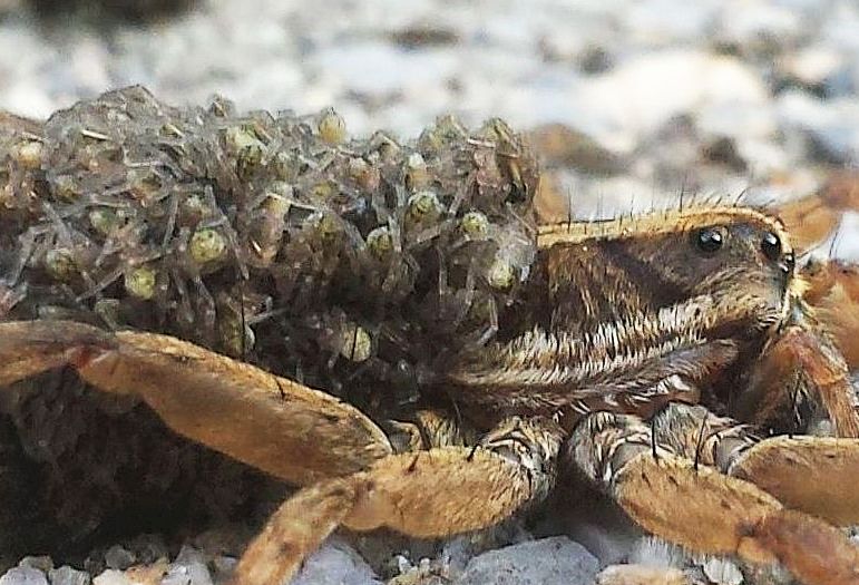 Wolf Spider with spiderlings on its back 2015-8-17 by David, D&M MD - on a paver on path between garage and house