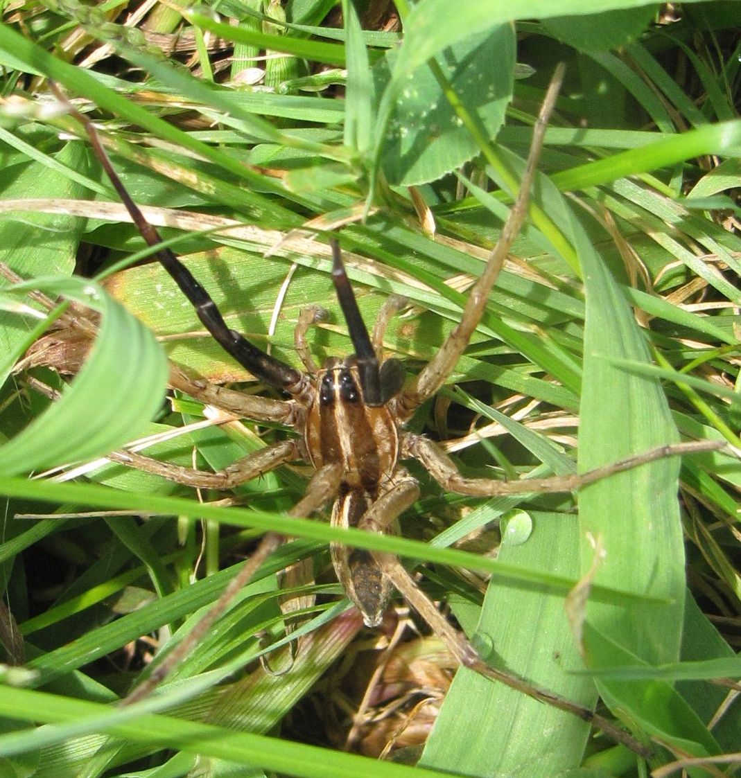 Saw something large and brown scurrying through the grass. Never thought it was a spider. When I got closer I thought maybe it was a Grass Spider. I got even closer and it stopped dead in its tracks - that right there should have told me it wasn't a Grass Spider. When I bent over and looked closer it jumped at me at the same the time I realized it had two black front legs. I marked the spot with a piece of straw and got the camera. Lucky for me it was still there. This time the camera was between it and my face, but it didn't jump at me again. I took a few pictures and encouraged it to go on its way. I got so excited I showed the neighbors the pictures and forgot I just had Brie for lunch. :/