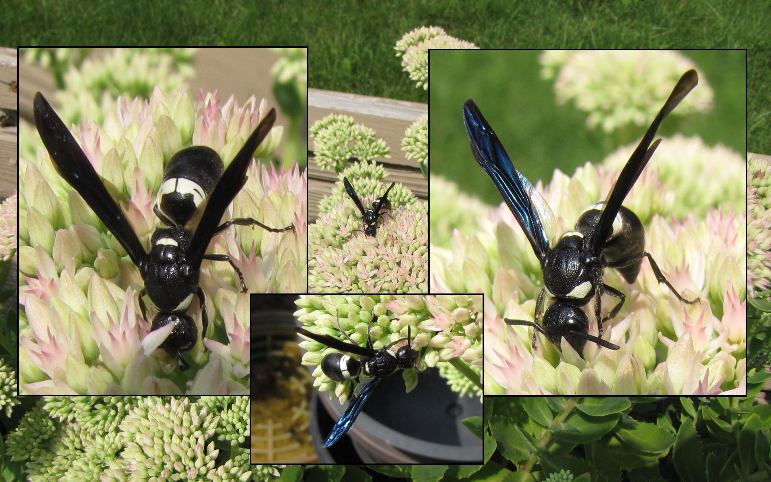 Comments on (BG) Four-toothed Mason Wasp (Monobia quadridens) nectaring on flowers or maybe feeding on the pollen